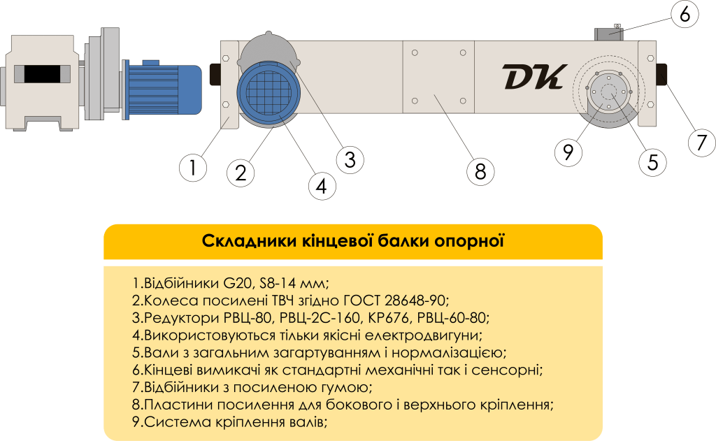 Кінцева балка опорного типу BR — призначена для приведення в рух конструкції підйому (кран — балки) Передсування кінцевої балки по крановому шляху виконується за рахунок букс з колесами одна з яких має ел.двигун. В залежності від ступеня навантаження кінцеві балки можуть бути оснащені декількома приводами на кожне колесо у режимах важкого використання.